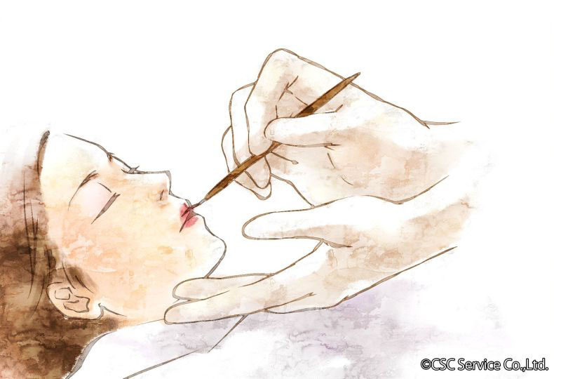 湯灌師為逝者化上自然顯氣色的淡妝,此時親屬可以在一旁觀看,也可以提出想要修改的部分或是提供逝者生前的化妝品來使用。