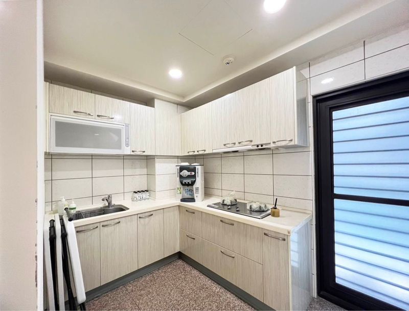 超大團體休息空間,每日都有服務人員清潔打掃。 茶水間飲水機供應熱水,也有瓶裝水可飲用。